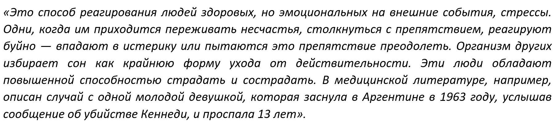 Но есть и особая форма – «истерический сон». Вот что по этому поводу говорит профессор А. М. Вейн: