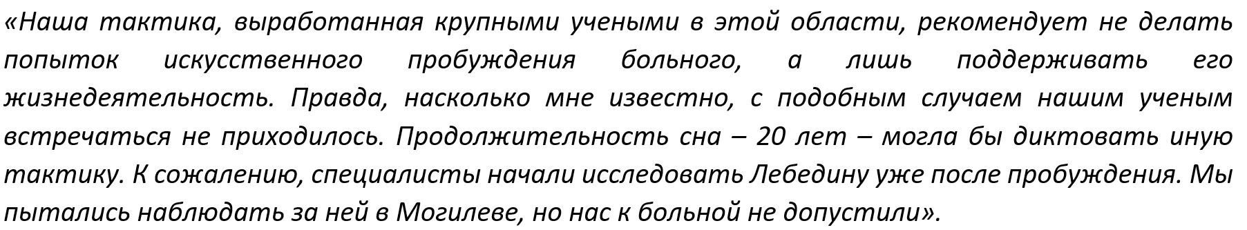 Вот как вспоминает работу с пробудившейся после 20-летнего сна женщиной ассистент кафедры нервных болезней А. М. Васитинская: