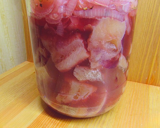 Выкладываем в банку с селёдкой лучок и заливаем винным соусом.