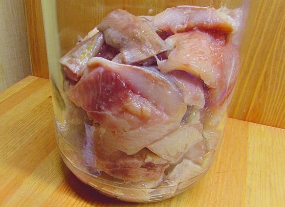 Разрезаем на небольшие кусочки, чтобы можно съесть на раз. Складываем нарезанную сельдь в банку объемом 1.5-2 литра.