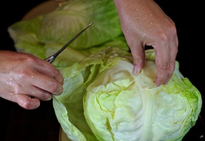 Итак, берем кочан капусты и ножом вырезаем кочерыжку.