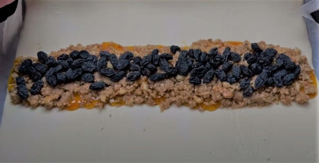 Достаем слоенное тесто. Даем ему разморозиться. Тесто полностью разворачиваем. Дно промазываем сладким вареньем, сверху выкладываем пасту из грецких орехов, далее идет изюм. Начинка готова, осталось только запечь все.