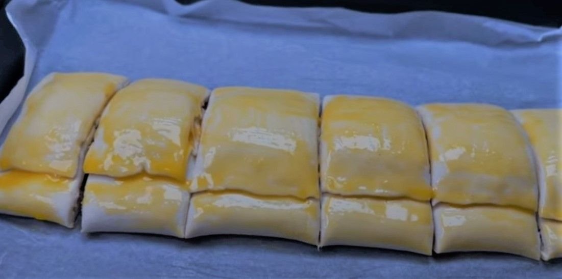 Будущие лакомство делим на части. Смазываем желтком и отправляем в духовку. Выпекаем при 200 градусах, около 20 минут.