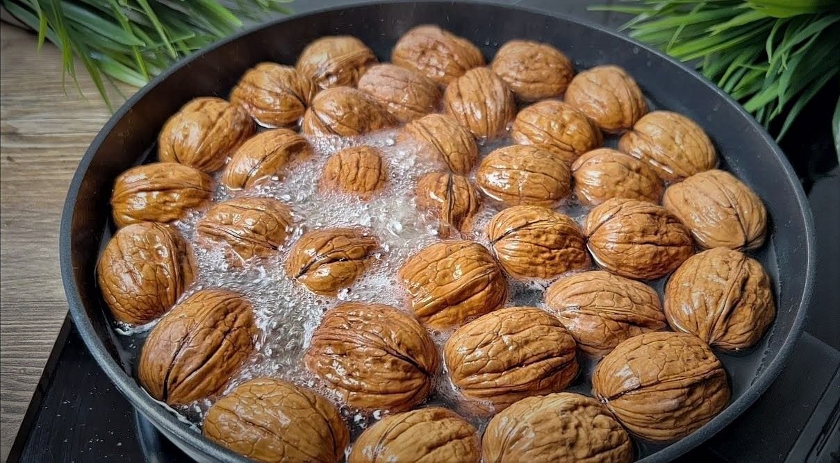 Для начала отвариваем наши орехи — бросаем из в кипящую воду. Варим около 3-4 минут, до полной готовности. Таким простым образом избавляемся от горечи, да и орехи становятся вкуснее. После размещаем их на полотенце и просушиваем.
