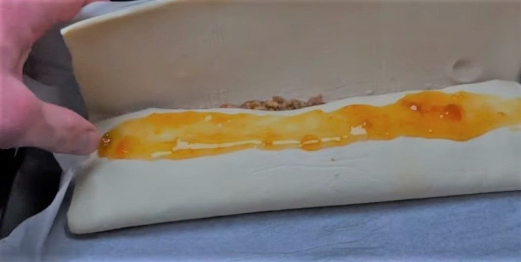 Заворачиваем все в рулетик. Сверху промазываем вареньем, чтобы скрепить края. В худшем случае — просто защипните край теста.
