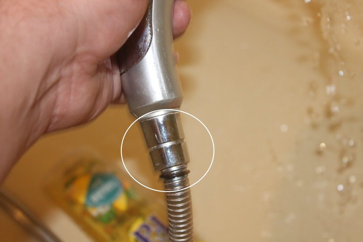 Для начала, снимаем лейку со шланга, можно конечно и не снимать, но будет не совсем удобно.