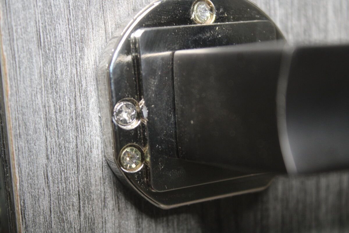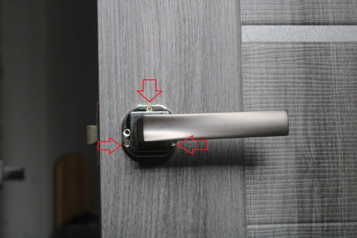 Снимаем и смотрим, самая дверная ручка крепится с помощью трех саморезов к основанию двери. И по первому времени, данного крепежа хватает, но буквально через месяц или два, данные саморезы начнут «гулять» и ваша ручка разболтается.