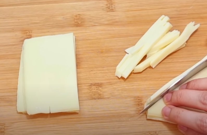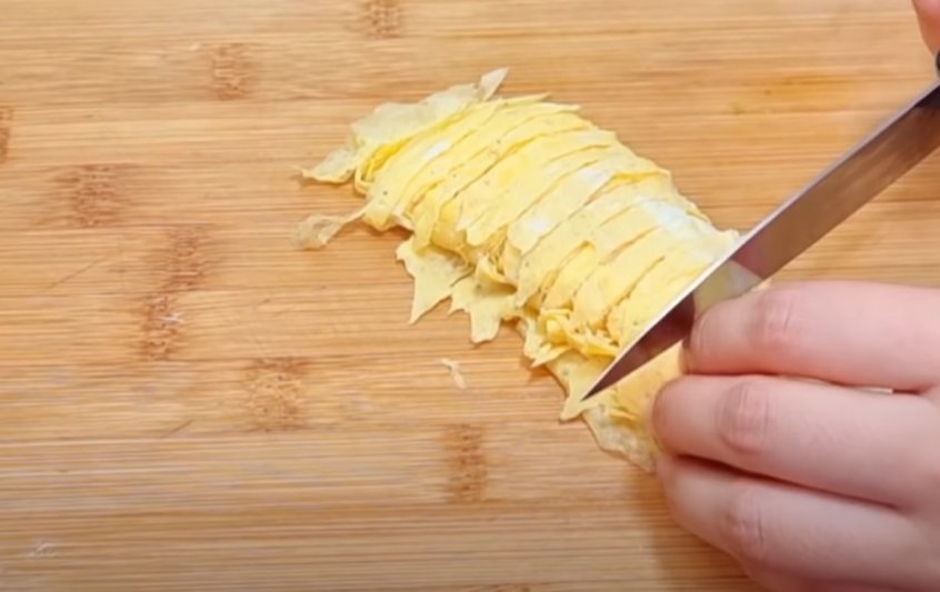 3. Сложите эти блинчики друг на друга, скрутите трубочкой и порежьте ножом.