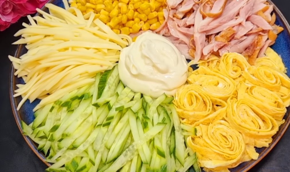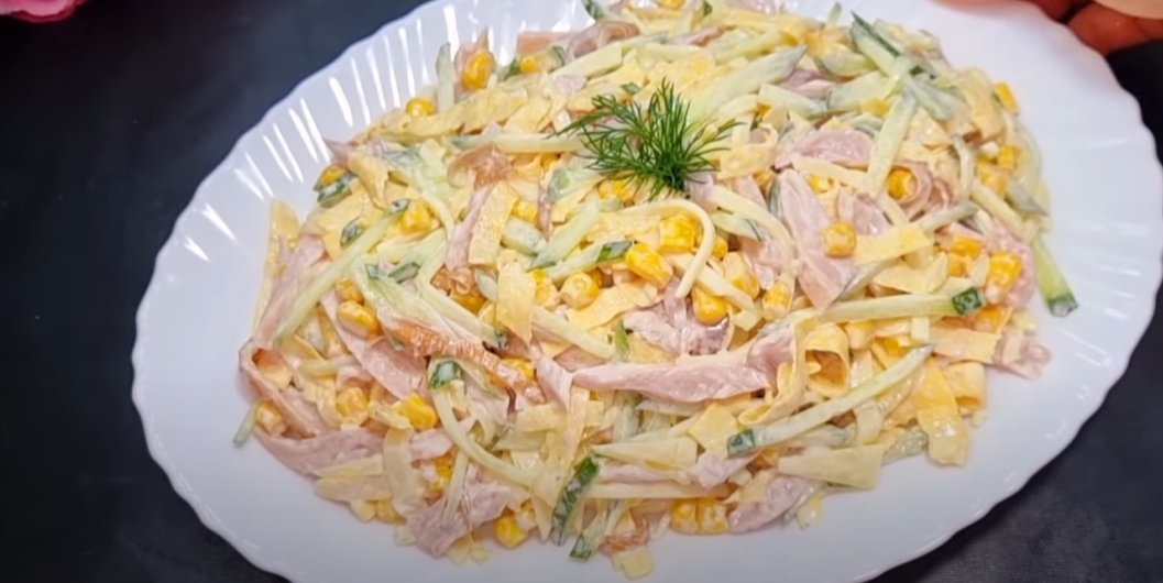 5. Огурце и сыр порежьте также тоненькой соломкой. Также для салата понадобится консервированная кукуруза.
