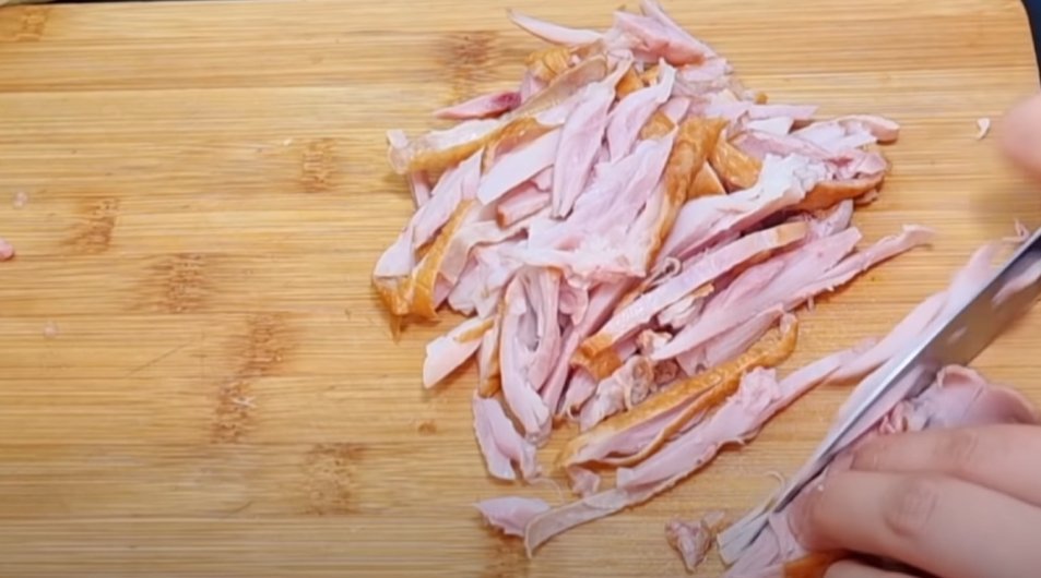 4. Копчёный куриный окорочок порежьте на небольшие полосочки. Для данного салата лучше брать именно копчённую курицу.