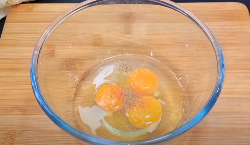 1. Разбейте 3 яйца, посолите и поперчите их по вкусу. Взболтайте немного вилкой.